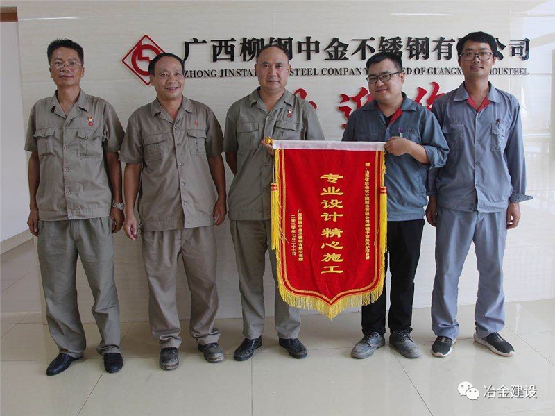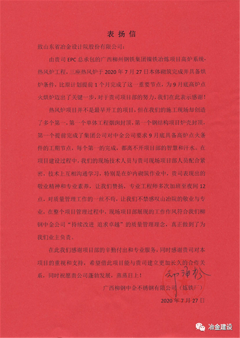 就是憑著這股韌勁和山冶設計“敢打硬仗、一切為用戶著想”的精神,柳鋼中金熱風爐工程的各項工作推進順利,并多次在安全、質量、進度大例會上受到表揚。在27日砌筑封頂之后,上午柳鋼中金煉鐵廠送來表揚信,對現場項目部的工作給予了肯定,下午柳鋼中金公司副總經理張洪波授予了現場項目部專業設計精心施工的錦旗,盛贊山冶設計專業、敬業!