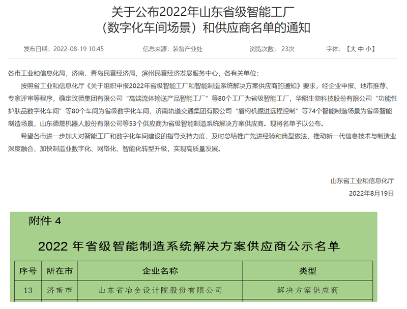 日前,山東省工業和信息化廳公布了2022年山東省級智能工廠(數字化車間場景)和供應商名單,我公司入選智能制造系統解決方案供應商。